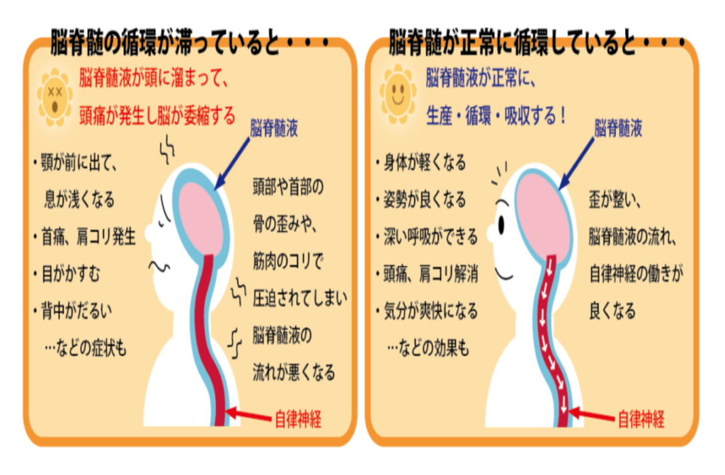 そのため、頭から腰までの姿勢が悪いと流れも悪くなり、頭に溜まってしまいます。頭に溜まると頭蓋骨を圧迫し、歪めていきます