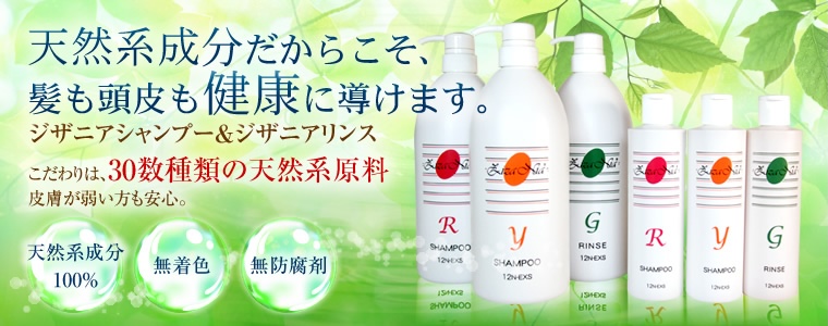 ジザニアのシャンプー&リンスは、天然系原料100%、20種類の生薬配合。無着色で防腐剤なども無添加です。毛髪だけでなく、皮膚に対しての安全性も高く、両面でご使用頂ける商品です。保湿力が高く、地肌のトラブルでお悩みの方にも喜ばれています