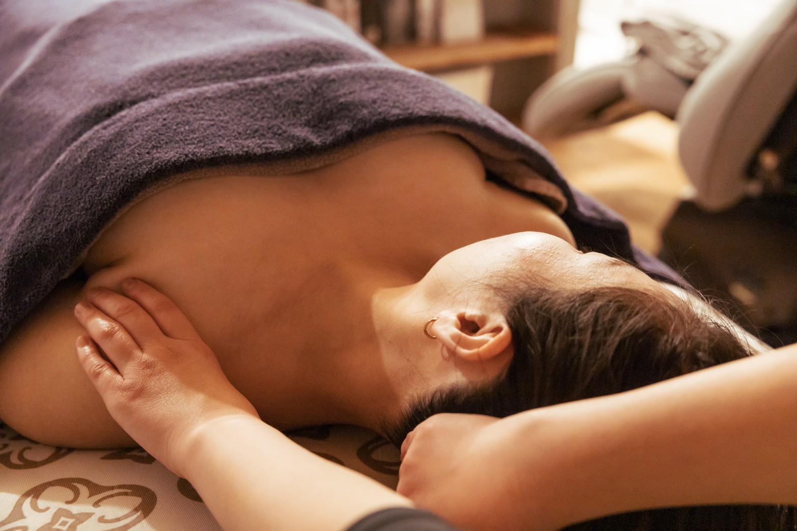 首・肩まわりのこわばりを心地よくほぐしていきます。力を抜きやすい状態へ導きます。